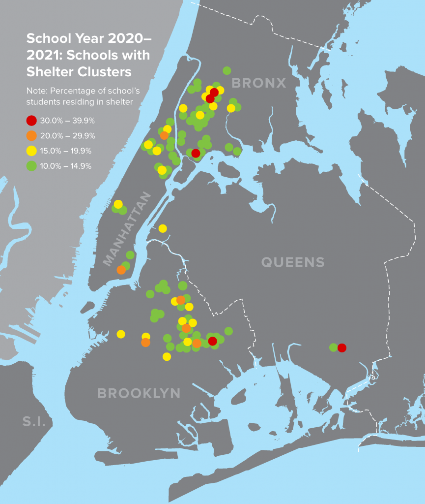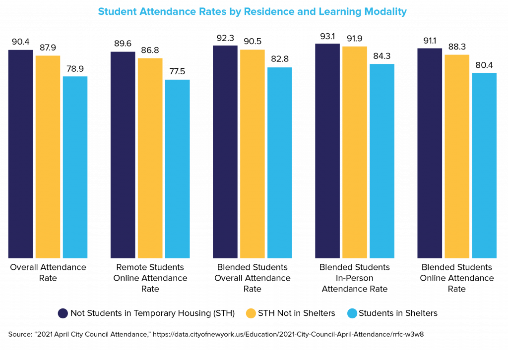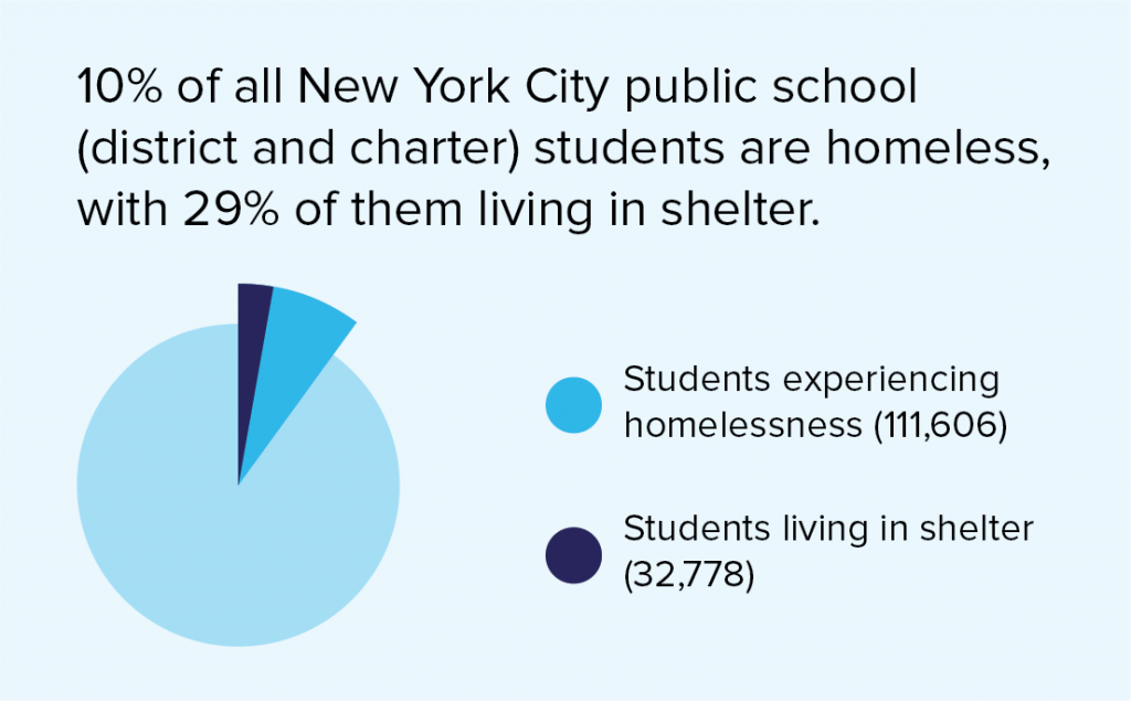 Much has been made of the loss in NYC schools’ enrollment. Data will eventually reveal if that reduction is permanent. It is striking that the loss in the overall student census is nearly equal to the number of students who lived in shelter during the last year for which data is available. As a sum on a spreadsheet, students living in shelter are a small portion of the overall student body. However, every single one of those students should be a signal to the DOE’s leaders that they cannot make good on their vision and mission, “to provid[e] every single child, in every classroom, in every New York City public school, with a rigorous, inspiring, and nurturing learning experience,” unless they proactively work to elevate the needs of students in shelter.40 Data on students in shelter must be deliberately collected and disaggregated throughout this school year and during every academic catch-up program41 so tailored solutions can be crafted with input from all stakeholders, including, importantly, shelter staff in direct relationship with students and their parents. To ensure an equitable education for students in shelter as New York City rebounds, everyone who works with children experiencing homelessness must collaborate to build sturdier bridges of support. Homeless children should be able to learn free from interruptions, in environments primed to help them succeed, with access to all learning tools, academic assistance, and robust social-emotional supports.