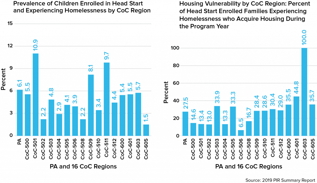 Recently, PAHSSCO, PEC, and Dr. Grace Whitney began analyzing Head Start data related to children and families experiencing homelessness or with housing-related needs, such as assistance with utility bills. Data is being analyzed and broken out according to the Commonwealth’s 16 Continuums of Care (CoC) to help CoCs better understand the experiences of and resources available from Head Start providers. Data will be shared with communities with the goal of helping CoCs find families they may not have already connected with needing housing supports, increasing enrollment in Head Start, and strengthening working relationships between housing providers and Head Start. Notably, this analysis project is also helping Head Start better understand the housing needs of Head Start families and the high demand for housing-related services among enrolled families. One in three PA Head Start families requesting some type of family services from their programs has needs related to housing, and the following graphs of Head Start data15 grouped by CoC illustrate that fewer than one in three PA Head Start families experiencing homelessness find housing during the program year.