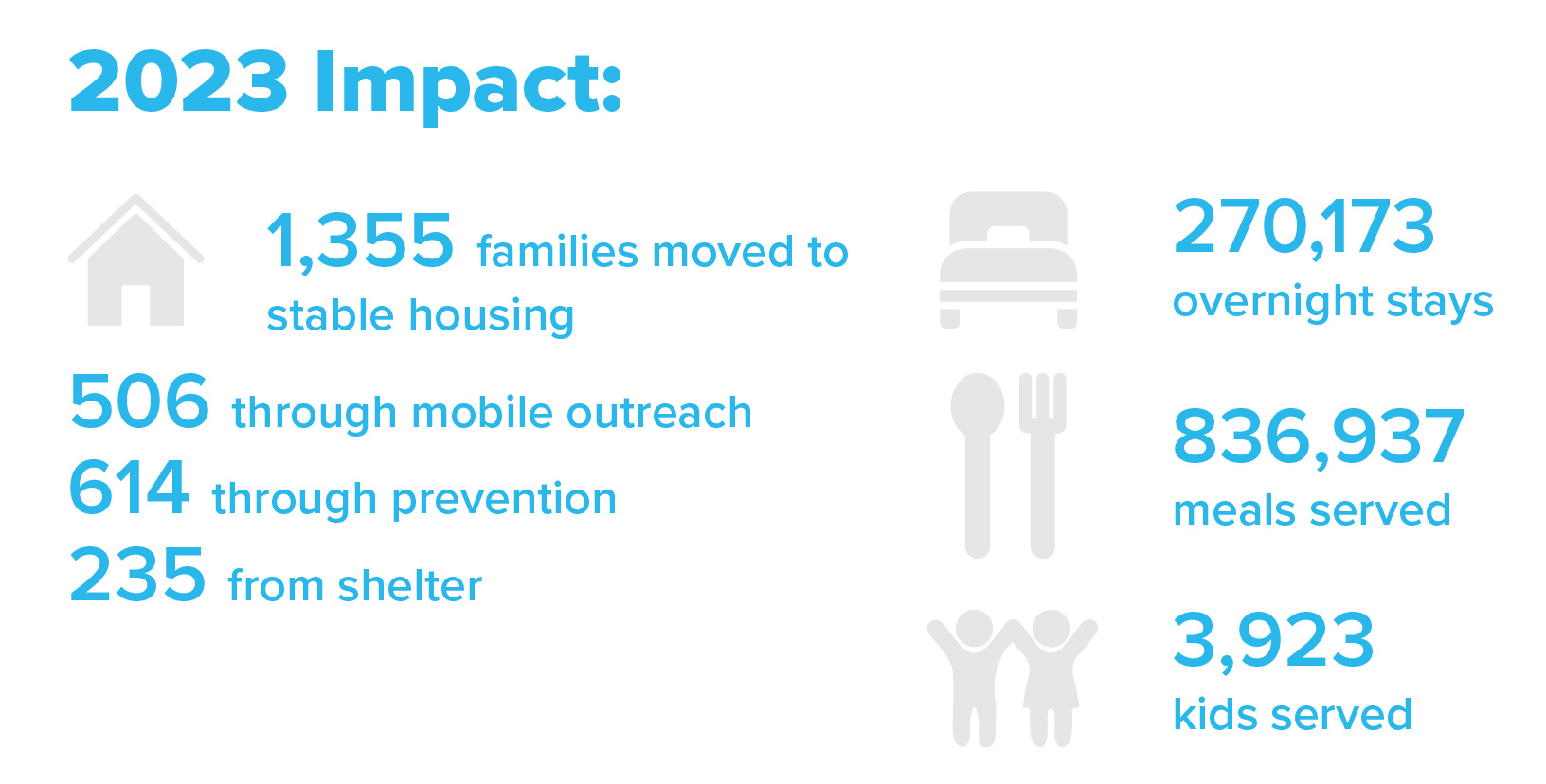 Prevention and stability support services can address financial emergencies before they lead to eviction. The prevention program includes financial education and planning support, helping families build long-term stability while addressing immediate needs. And helping families maintain stability is cost effective. Keeping a family in their home is less than half the cost of shelter services.