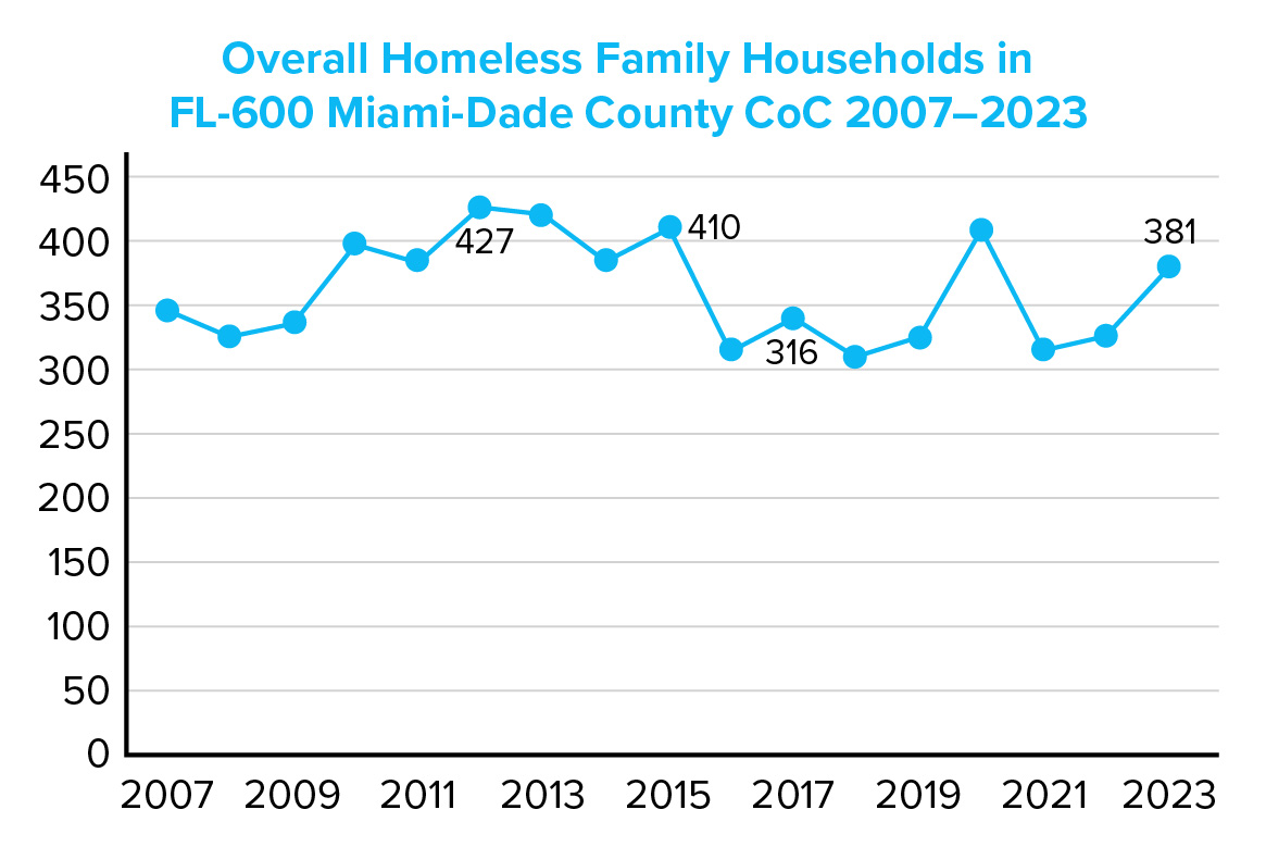Although the accuracy of the federal Annual Homeless Assessment Report to Congress (AHAR) estimates have been questioned by various observers as a vast undercount, the numbers are often the best gauge communities have to help them consistently track their homeless census over time. For the FL-600 Miami-Dade County Continuum of Care (CoC), the overall Homeless Family Households from 2007–2023 PIT Counts by CoC have held relatively steady. The average number of Homeless Family Households over this period was 363. The highest recorded number of households was 427 in 2012. The Miami-Dade County Homeless Trust Census indicates that the number of Homeless Family Households was 409, an increase of 28 homeless families—or 7%—from 2023. Note: the 2024 AHAR report was released at the time of publication so was not included in this article.