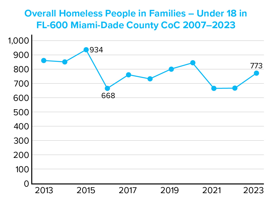 The average number of children experiencing homelessness who are part of homeless families in Miami between 2013 and 2023 was 778 (Overall Homeless People in Families – Under 18), almost the same number as the currently available figure of 773 (the 2024 figures released by the Miami-Dade County Homeless Trust Census do not include a breakdown by age).