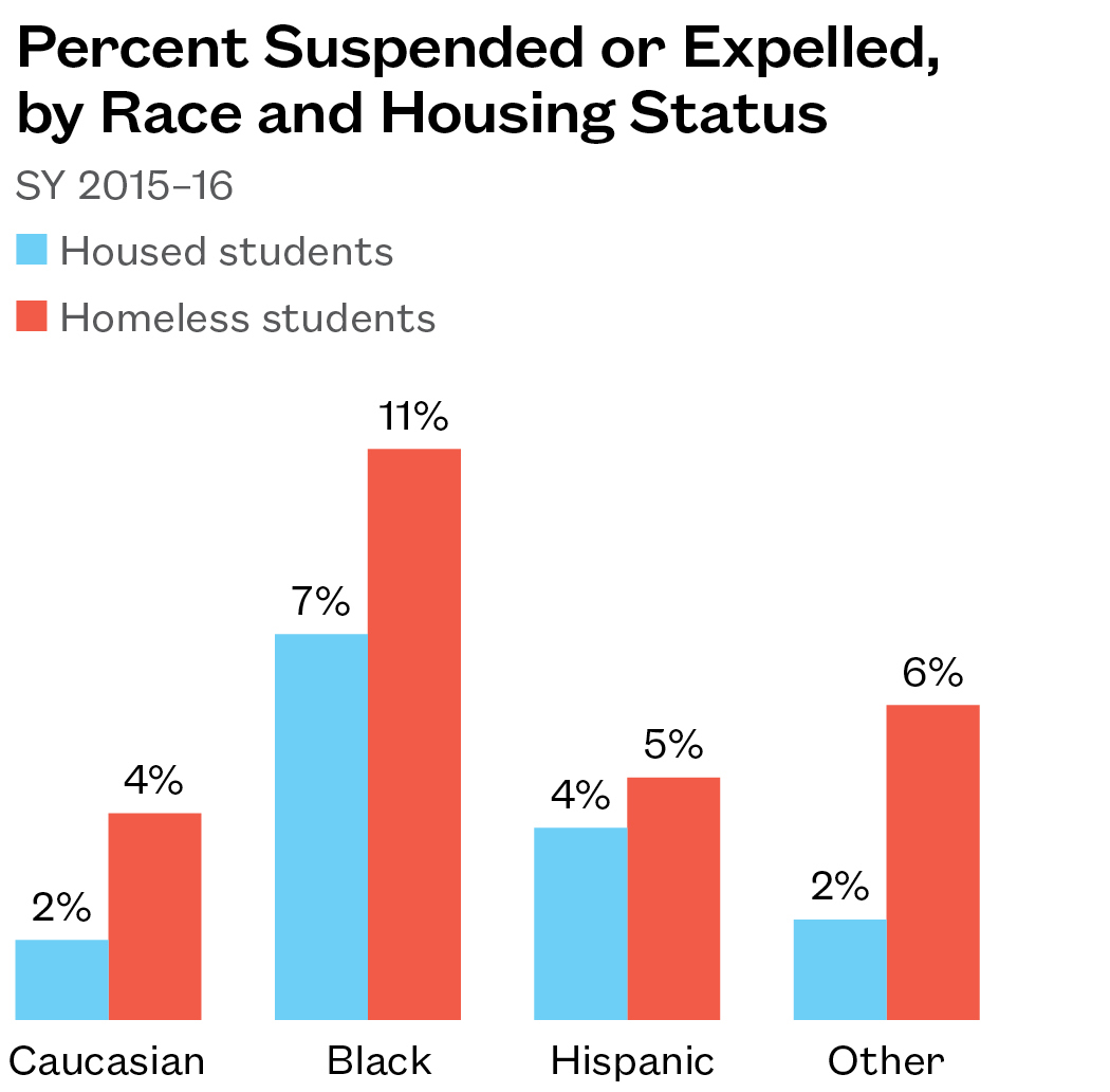 The gap in suspension rates grows even wider when race is considered. Seven percent of black students who were always housed in SY 2015–16 received a suspension or expulsion in that year, compared to 2% of white students who were always housed. For homeless students, the suspension/expulsion rate is 11% for black students and 4% for white students.