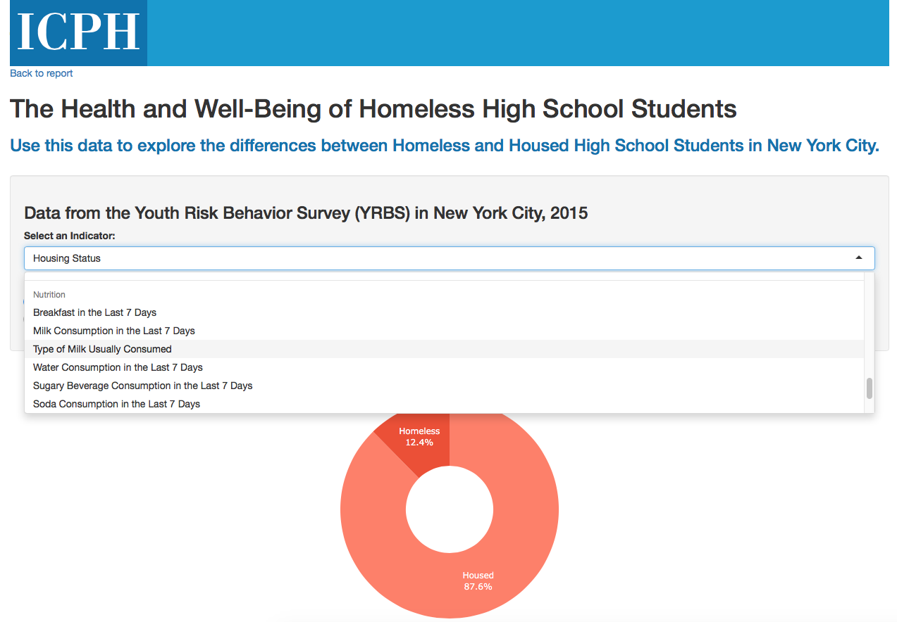 In addition, ICPH continues to update our Health and Well-Being online data tool, which visualizes data from the CDC’s Youth Risk Behavior Study. The data we’ve worked to analyze and understand is easily accessible and downloadable for grant applications, policy briefs, and general information. Recently, we added detailed data around nutrition. When 33% of homeless high school students haven’t eaten breakfast in a week, we absolutely need a deeper dialogue around access to food.