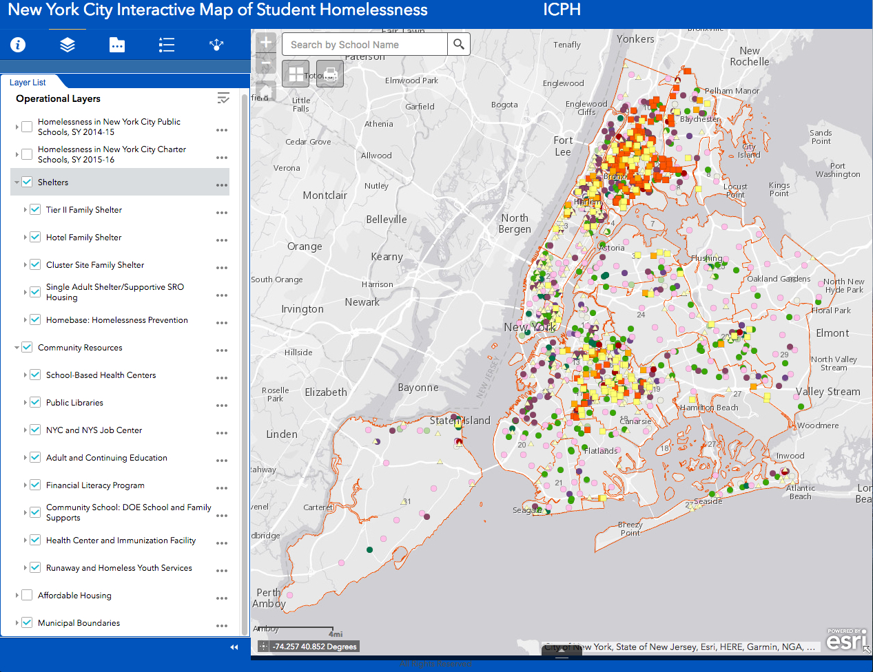 With that in mind, the Institue for Children, Poverty, and Homelessness added additional data to our Interactive Map of Student Homelessness so that educators, policy-makers, advocates, and all New Yorkers can see the big picture regarding student homelessness: what’s available—and what’s missing—in every neighborhood. The awareness of a concentration of homeless students in one part of the city, along with a list of available resources, may be useful. Seeing them plotted on a map, however, tells an even fuller story.