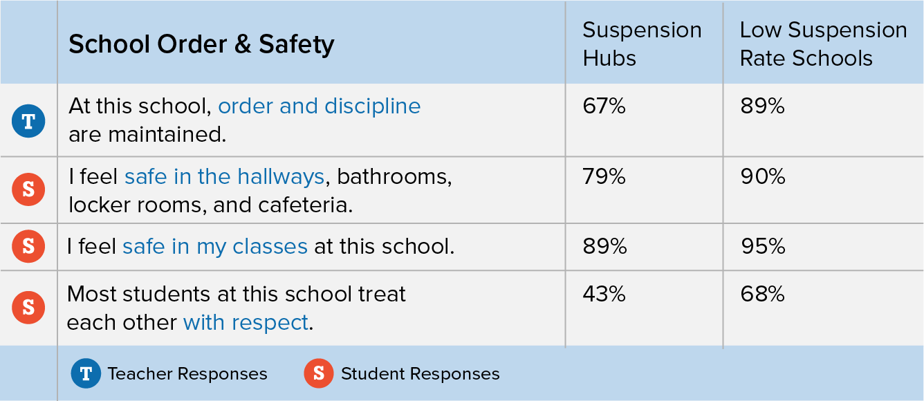 In schools with low suspension rates, nine out of ten teachers agreed that order and discipline are maintained, while in suspension hubs—schools with the highest suspension rates citywide—just seven out of ten teachers agreed (89% to 67%). Student responses also showed a similar pattern: over two-thirds of students attending middle schools with low suspension rates reported that their peers treated each other with respect compared to only 43% of students attending suspension hubs.