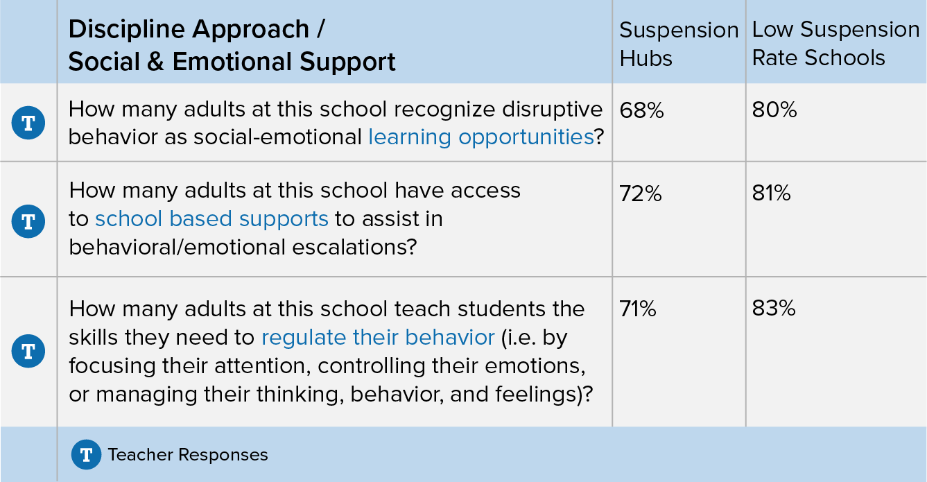 Ensuring that schools and teachers have the tools and resources to effectively manage their classrooms is key to fostering school environments that are truly welcoming for all—including vulnerable students such as those experiencing homelessness who might act out due to experiences of family instability and trauma. Schools with low suspension rates were more likely to have additional school-based supports to assist teachers with behavioral or emotional escalations compared to teachers in suspension hubs. Specifically, 81% of teachers in low suspension schools reported access to these supports versus 72% of teachers in suspension hubs. Even further, 80% of teachers in schools with the lowest suspension rates recognized disruptive behavior as a social-emotional learning opportunity compared to only 68% of teachers in suspension hubs.