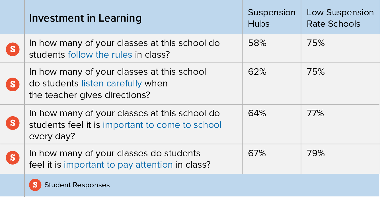 Suspensions not only result in students missing out on valuable learning time but can set back the learning process and cause students to become disengaged in school. In schools with higher suspension rates, survey results showed that students were less likely to follow directions (58%), listen to the teacher’s instructions (62%), and feel that attending school daily is important (64%) than at schools with low suspension rates.