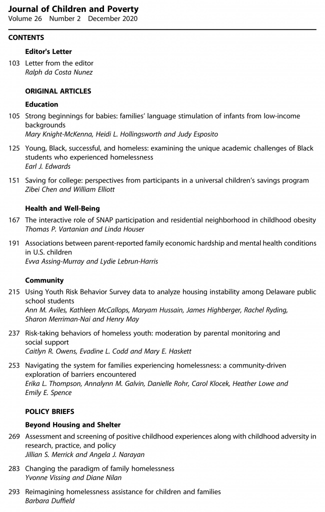 After more than 20 years, ICPH, Routledge, and Taylor & Francis have agreed to discontinue publishing the Journal of Children and Poverty at the end of 2020. It has been a pleasure collaborating with individuals, groups, and organizations from across the globe to push forward the important research and conversation about children, poverty, and homelessness. ICPH will continue to do so through its other avenues. To find out more, please visit https://dev.icph.org/.