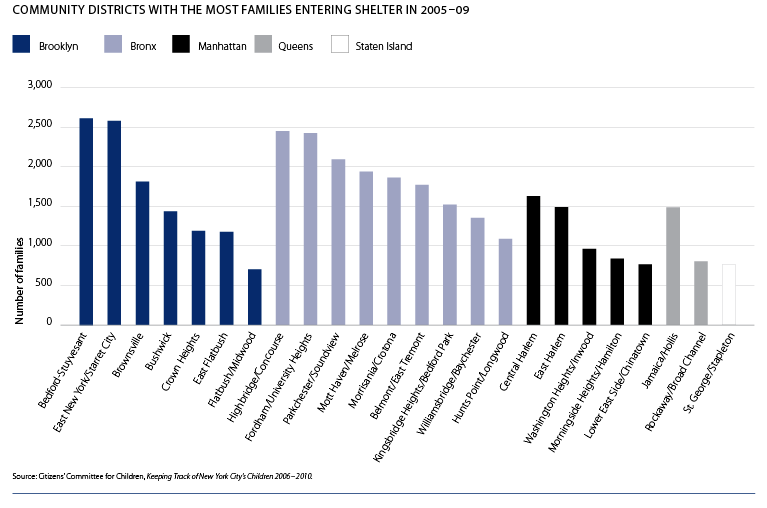 In the period from 2005 to 2009, 49,403 families entered the Department of Homeless Services’ (DHS) shelter system.2 Of course, the need for shelter is not equal across the city. As seen in Figure 1, community districts in the South Bronx and central Brooklyn dominate the list of the highest-contributing areas, while comparatively few families in shelter come from Manhattan. This pattern may not seem surprising to those familiar with the demographics of New York City and its 59 community districts, but awareness of where shelter entrants are coming from, and how geographic trends shift over time, is key to understanding and ultimately addressing the multiple pathways leading to homelessness.