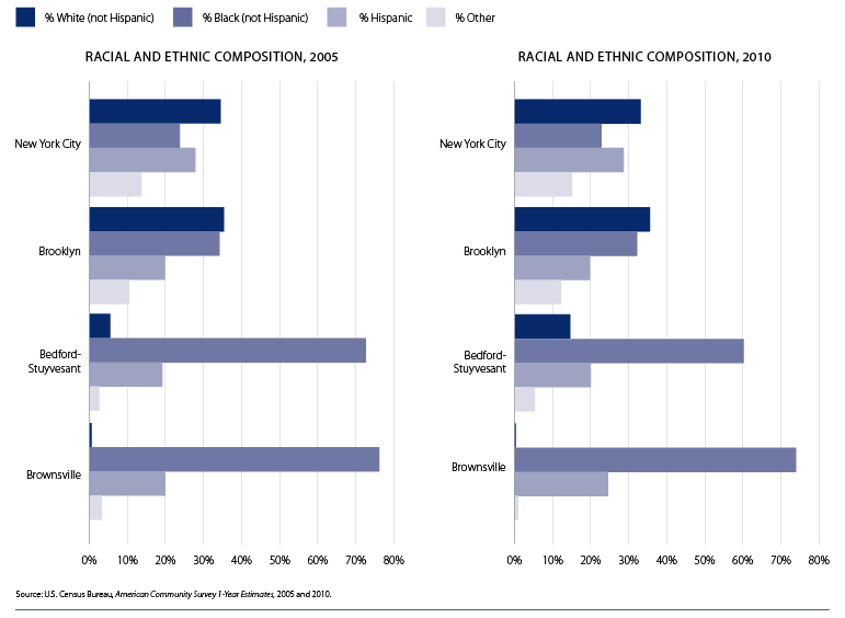 At first glance, the differences between Bedford-Stuyvesant (Bed-Stuy) and Brownsville are puzzling. Because they are neighbors, one might expect some amount of uniformity across their economic indicators. To an extent, there is: both neighborhoods have a high rate of family homelessness. Bed-Stuy, however, saw the beginnings of gentrification in the five years under consideration, despite contributing 2,617 families to the shelter system from 2005 to 2009. Its neighbor to the east, Brownsville, is packed densely with housing projects and has been an area of concentrated poverty for its black and Hispanic residents for many years, with few improvements and, in some areas, declines. Brownsville also has a large number of families entering shelter—1,812 over the same period. By examining race, the influence of public housing, levels of education and income, and housing costs in these adjacent neighborhoods, it is possible to understand how localized gentrification can destabilize the balanced distribution of regional poverty, even in areas where total homelessness remains high.