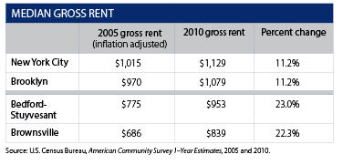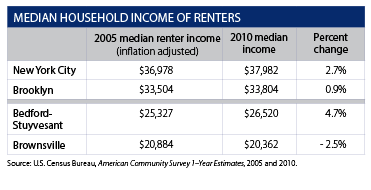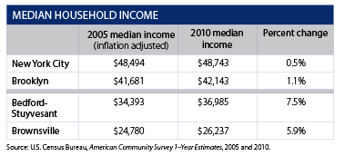 Brownsville and Bed-Stuy, the average monthly rent has in-creased at approximately double the rate seen both in Brooklyn and citywide (see Table 3). Given that rising rental costs are likely to move in tandem with higher household incomes, one might expect that the matching trends seen in the two neighborhoods indicate a similar parallel in the earnings of local residents. As seen in Tables 4 and 5, this has not been the case.
