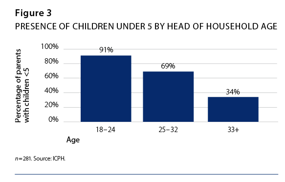 Age is pertinent to employment also because younger parents are more likely to have young children. As children under five are not yet in school, parents may choose to stay out of the workforce if they do not have alternative childcare arrangements that are affordable, accessible, and adequate.9 Ninety-one percent of young parents (18–24) had at least one child younger than five, while only 34% of older parents had a child under five (see Figure 3).