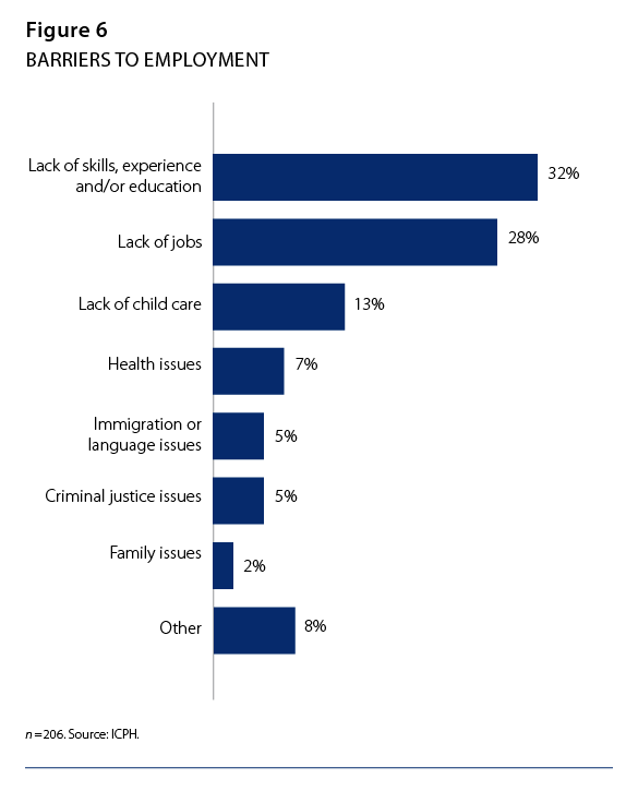 Neither parent age, trauma history, education, nor the presence of young children can fully explain the low levels of employment among homeless heads of household. Non-working parents (including those without a work history) reported seven major barriers to employment (see Figure 6): 32% highlighted a lack of skills, experience, or adequate education, 28% a lack of jobs, and 13% a lack of child care. Addressing these three barriers would help almost 75% of homeless heads of household to overcome their single greatest perceived obstacle to employment.