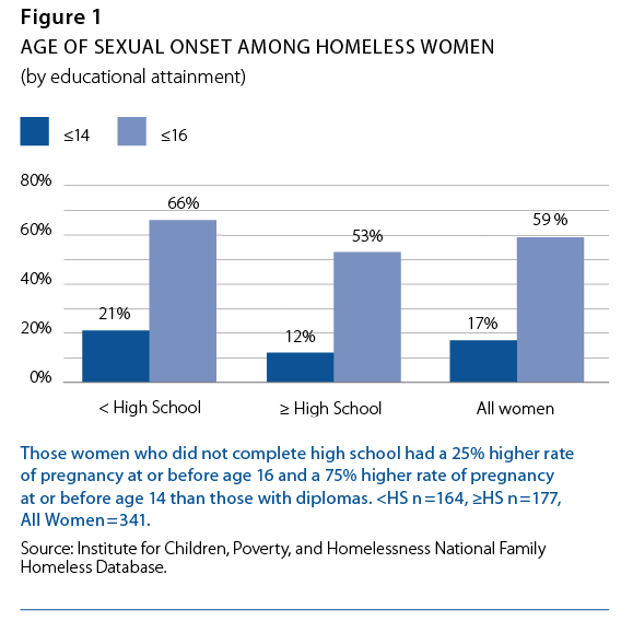 According to the Centers for Disease Control, the average age of sexual onset for young women nationally is 17.4 years.4 For homeless women, however, sexual initiation occurs nearly one year earlier, at age 16.5.5 When the data is controlled by educational attainment, a story emerges that speaks to the significance of a high school degree: of those women who did not complete high school (48%), 21% had had sex at or before age 14 and 66% at or before age 16, while only 12% of women who achieved a high school education or more were sexually active at age 14 or before and 53% at age 16 or before. (See Figure 1.) Though it is tempting to interpret the relationship between sexual decision making and educational attainment as causal, it may be more accurate to view both poor family planning and lack of schooling as outcomes of multiple interacting factors associated with poverty.
