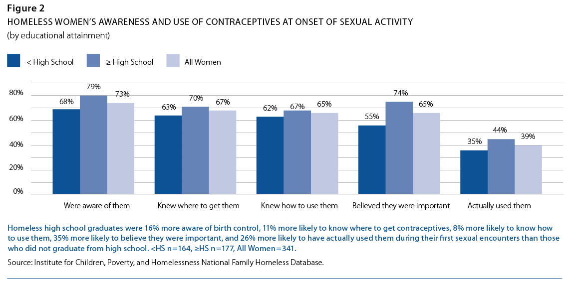 The early sexual initiation of homeless women is most troubling when viewed through the lens of birth control. Despite both groups’ reporting awareness of birth control (73%), understanding of where to obtain contraceptives (67%), knowledge of how to use them (65%), and the belief that birth control was important the first time they had sex (65%), only 39% of the total sample reported using contraception during their first sexual encounter. (See Figure 2.) Again, lower educational attainment was associated with lower awareness, less knowledge of where to find contraceptives, less understanding of how to use them, less belief in their importance, and failure to use them during first sex act. This pattern seems to imply that those women who feel the least invested in the education process and least focused on their future prospects also exhibit the least willingness to make arrangements to avoid unplanned pregnancy.