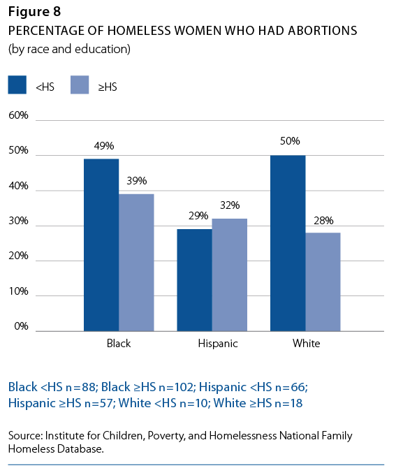In this cohort, 38% of the women had undergone abortion at least once in their lives. Race played a factor in one’s likelihood of having had an abortion, with 44% of black, 30% of Hispanic, and 36% of white homeless women undergoing the procedure. In addition to race, education plays an interesting role. Black homeless women who did not complete high school were 26% more likely to have had abortions over their life course than those who attained degrees. Likewise, white women were 79% more likely to have undergone abortions if they were non−degree holders. Interestingly, Hispanic women with diplomas were 10% more likely to have had abortions. (See Figure 8.) Clearly, whether a homeless woman graduated high school has implications for behaviors throughout her life.