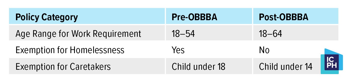 OBBBA extended SNAP new work requirements to people experiencing homelessness who have dependents ages 14 and over. Previously, people with children under the age of 18 who were experiencing homelessness were exempt from these work requirements.