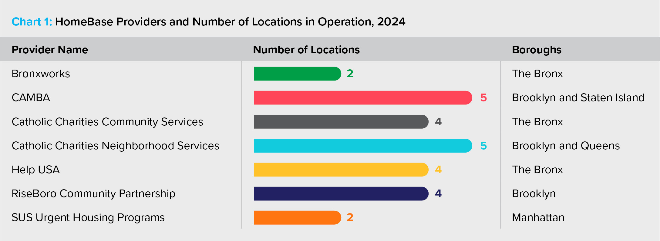In 2016, Mayor de Blasio’s administration conducted a 90-day efficiency review of homeless service agencies and programs. As a result, the City announced several changes to its services, notably the creation of the Department of Social Services (DSS), which would now oversee HRA and DHS, as well as the integration of DHS’s HomeBase prevention unit with HRA’s Homelessness Prevention Administration.15,16 HRA, which administered many other prevention programs, such as the Rental Assistance Unit, would take over the management of HomeBase.17 The Department of Social Services and the City saw this integration as a way to reduce inefficiencies in homeless services, allowing for more seamless client support. It expanded HomeBase’s role as the first point of entry for those at risk of homelessness. HomeBase offices were based in a family’s community, so they would ideally not need to go to the centralized intake office to access services. The de Blasio Administration doubled its funding of HomeBase and, from FY2015 to FY2017, increased the number of locations from 14 to 23.18 As of 2023, there are 26 HomeBase locations operated by seven nonprofit providers.19 The Bronx and Brooklyn have the greatest number of locations, with each of these boroughs hosting ten HomeBase offices.20 The nonprofit organizations (see Chart 1) contract with the City to provide services within the local community.21