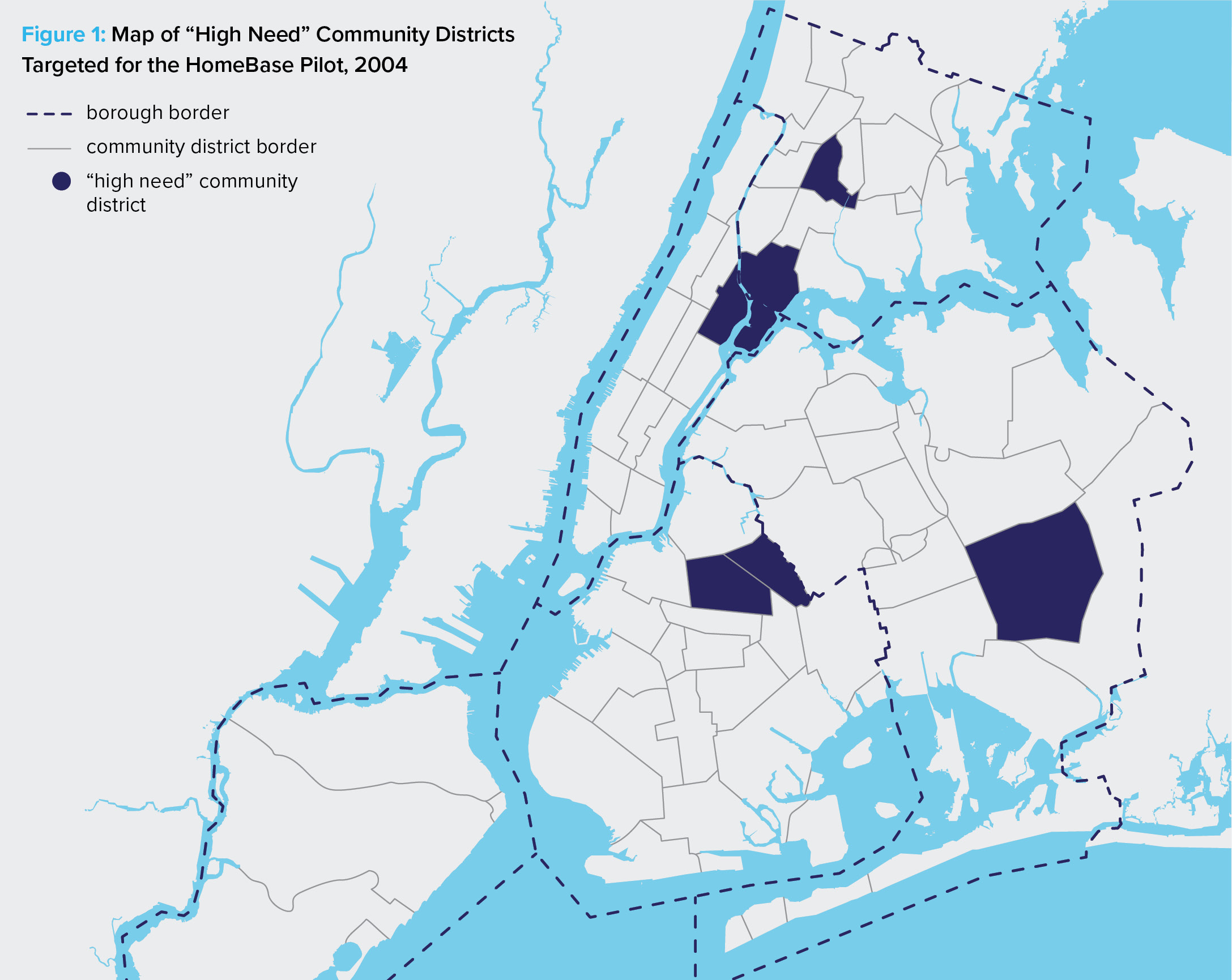 HomeBase’s pilot program was initially established in September 2004 in six community districts. These community districts were chosen based on their designation as “high need” as informed by an evaluation of a sample of shelter entrants’ last permanent addresses.10 The neighborhoods chosen were Bronx District 1 (South Bronx/Mott Haven), Bronx District 6 (East Tremont/Belmont), Brooklyn District 3 (Bedford-Stuyvesant), Brooklyn District 4 (Bushwick), Manhattan District 11 (East Harlem), and Queens District 12 (Jamaica/Hollis).11