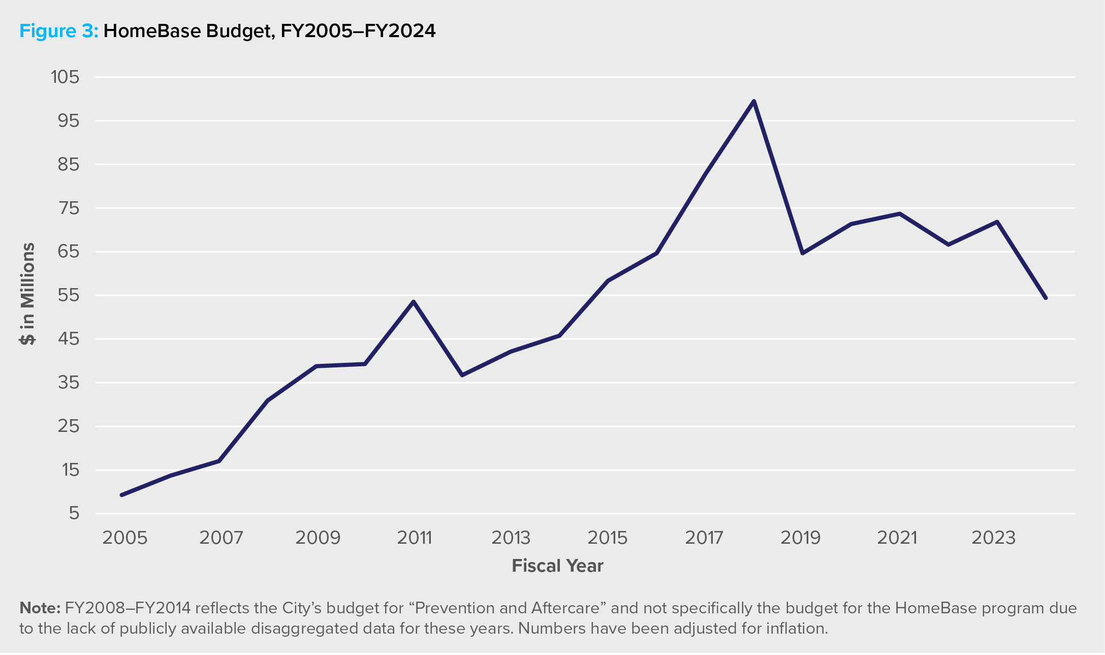 The operating budget for HomeBase has varied over the years but has generally shown an upward trend. This aligns with New York City’s efforts to reduce the rise in homelessness and keep families out of shelters. Fiscal Year 2018 saw the largest expenditure on HomeBase in the program’s history, when approximately $80 million (about $100 million in 2023 dollars) was spent. This was a proactive step toward fulfilling promises made by Mayor de Blasio during his two mayoral campaigns.