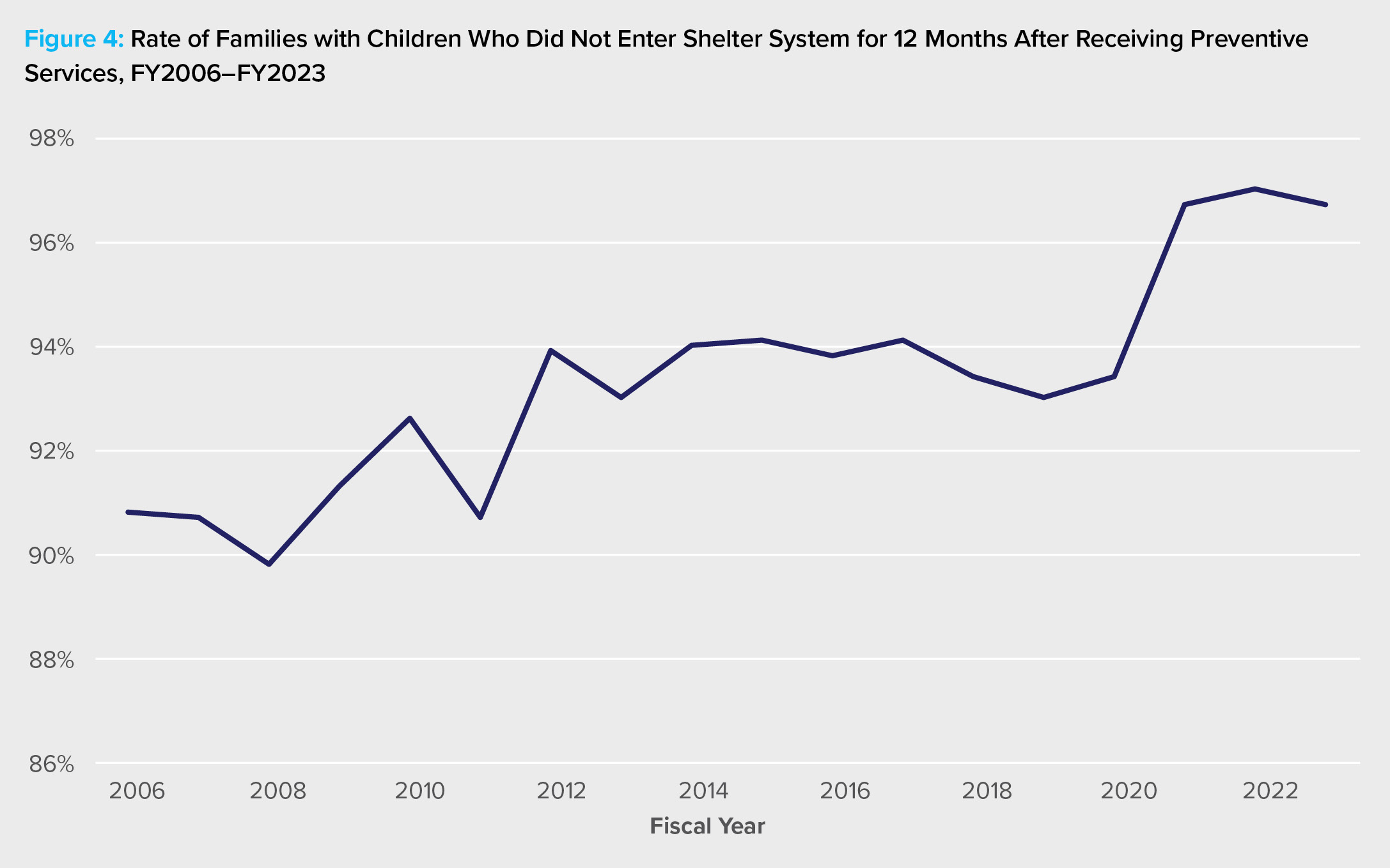The first data point provided is the number of families with children receiving preventative services who did not enter the shelter system for 12 months following receipt of services. Overall, HomeBase has consistently maintained a prevention rate of around 90% or higher, trending positively over time but plateauing around 97% in recent fiscal years (see Figure 4). However, we do not know what share of families sought services but did not receive them. We also do not know anything else about the families—what type of services did they require? How long did HomeBase work with them? What communities need services more than others?