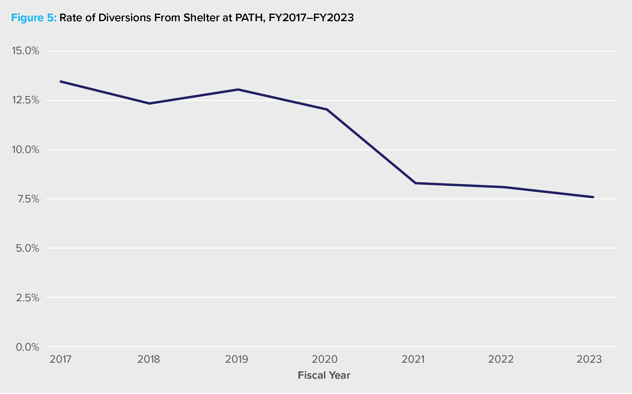 The second indicator is the percentage of clients successfully diverted at PATH from entering a homeless shelter. Prior to FY2017, the percent presented in the MMR included duplicates; thus, numbers pre-2017 and post-2017 cannot be compared. Overall, the number has declined in recent years, though it has consistently remained below 20% of all clients (see Figure 5). Again, we wonder what types of services these families used to prevent their entrance to shelter. How did the City manage to keep them housed? What tools are particularly helpful, and in which communities?