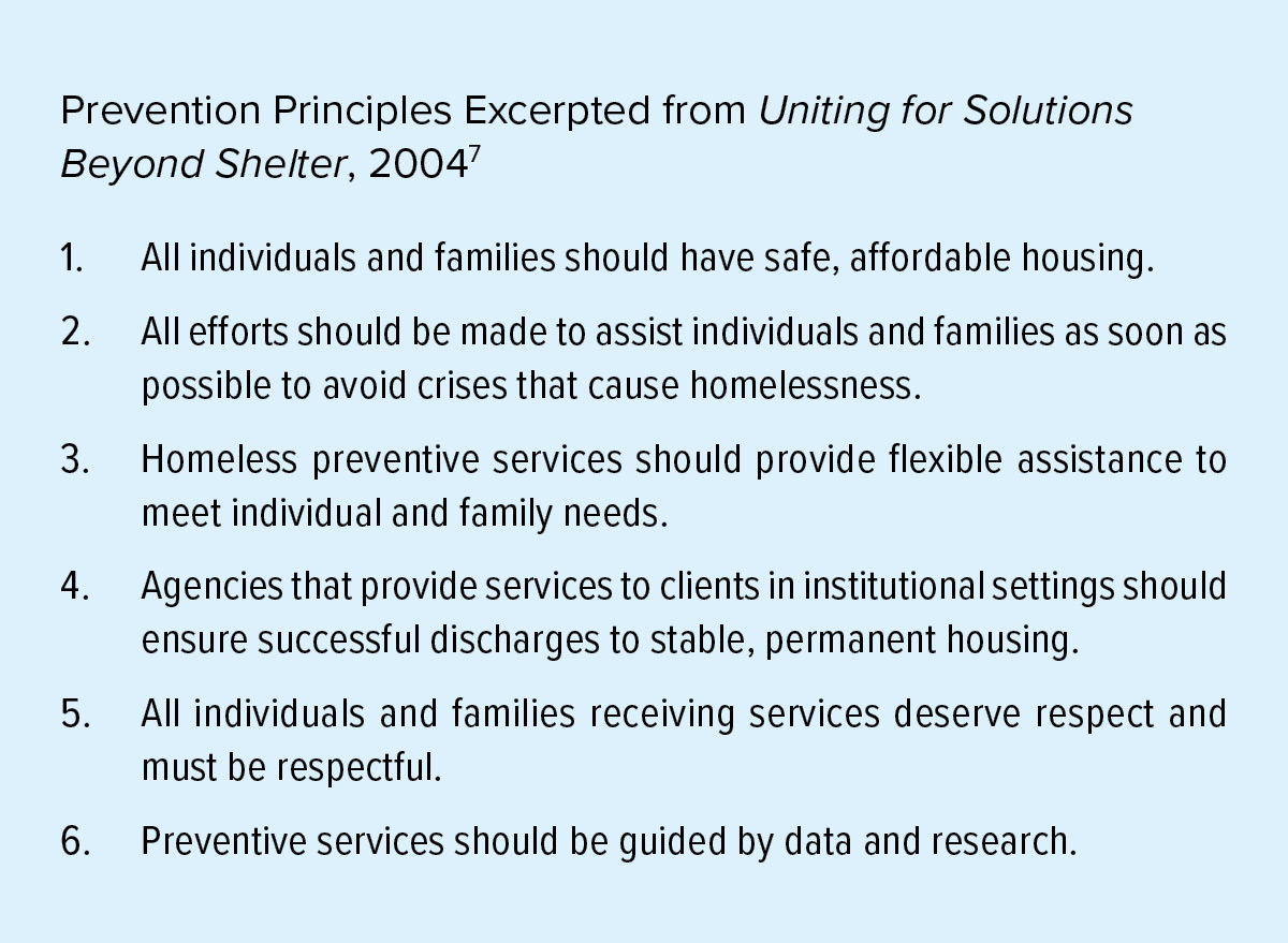 Prevention – Programs and services to help keep individuals or families at imminent risk of homelessness from moving into a shelter or living in a place not meant for human habitation.