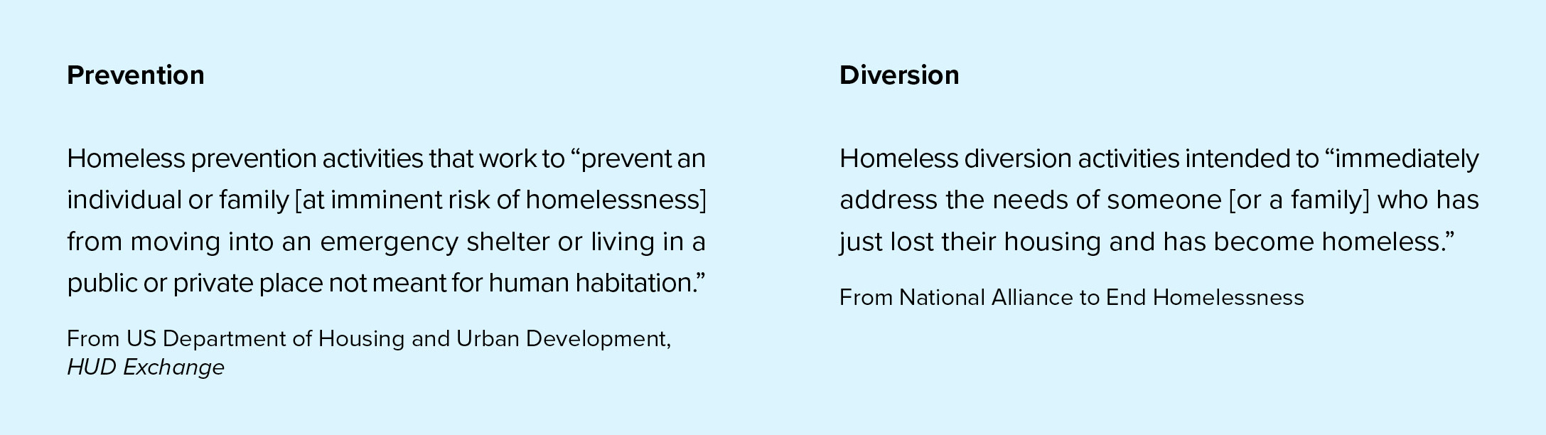 Diversion – Programs and services that immediately help individuals or families who have just lost their housing to keep them from entering shelter.