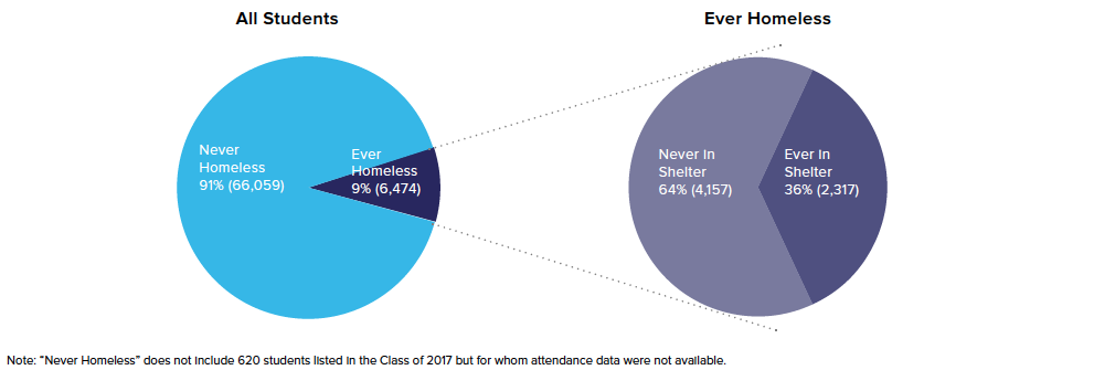 Nearly one in every 10 graduates of New York City public schools in 2017 had experienced homelessness at some point during high school. Of those, almost two-thirds of homeless students had never been in shelter, but lived in doubled-up or other temporary living arrangements. The remaining one-third of homeless students lived in a shelter at some point during high school.