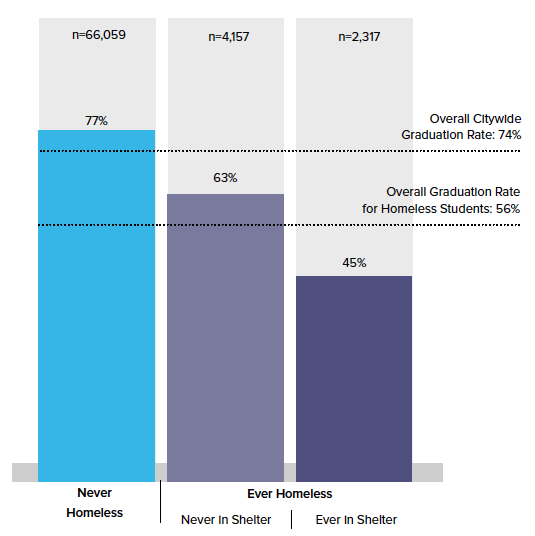 - Less than half (45%) of homeless students who lived in a shelter at any point during high school graduated on time. This rate was significantly lower than the 56% rate for all homeless students, and less than two-thirds the 74% rate for all students.