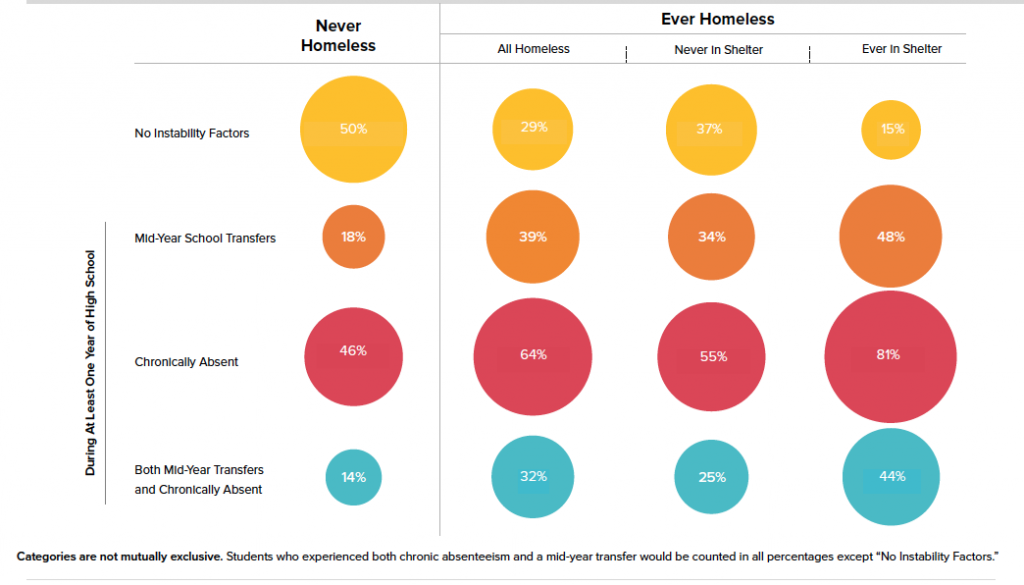 - Homeless students were much more likely to experience instability factors such as midyear school transfers and chronic absenteeism. Less than a third (29%) of homeless students experienced neither of these instability factors, compared to half (50%) of students who were never homeless during high school.