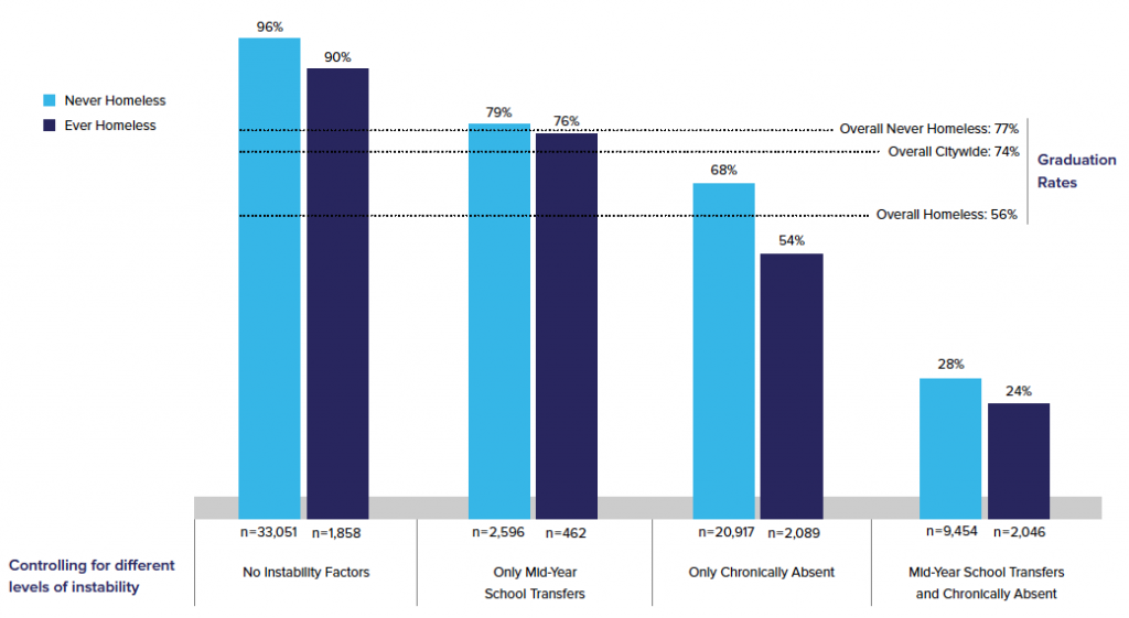 Homeless high school students face many disadvantages as they enter adulthood, but lacking a high school diploma should not be one of them. As this report demonstrates, homeless students who experience no school instability factors, meaning they do not transfer schools during the year and they are not chronically absent, will graduate at levels significantly higher than the 74% citywide graduation rate and almost equal to their never-homeless classmates (90% vs. 96%). Unfortunately, two in every three homeless students experience at least one of these instability factors, compared to just half of their never-homeless peers.