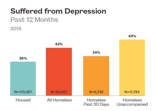During the past 12 months, 43% of homeless teens struggled with depression compared to 28% of their housed peers.