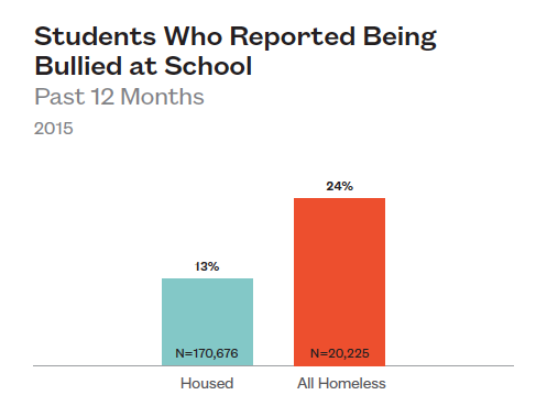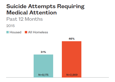 Not only do homeless high school students consider suicide more often than their housed peers, but they are also more than three times more likely to have attempted suicide in the last year (19% to 6%).