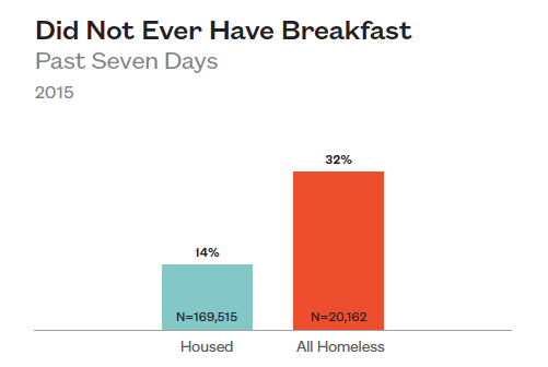 Homeless high school students are more than twice as likely than their housed peers to go to school hungry. In the past seven days, 32% of homeless students did not have breakfast compared to just 14% of housed students.