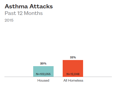 Among high school students with asthma, homeless teens are more likely to have had an asthma attack in the past twelve months. A third of homeless students with asthma have had an attack compared to 20% of their housed peers.