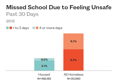 Homeless high school students also miss more total school days due to safety concerns. Over 6% of homeless students missed four or more days of school in the past 30 days due to safety concerns compared to less than 1% of housed students.