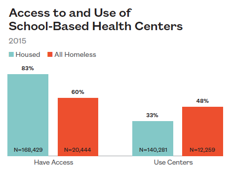 Homeless high school students are less likely to have access to a school-based health center than their housed peers (60% to 83% respectively).