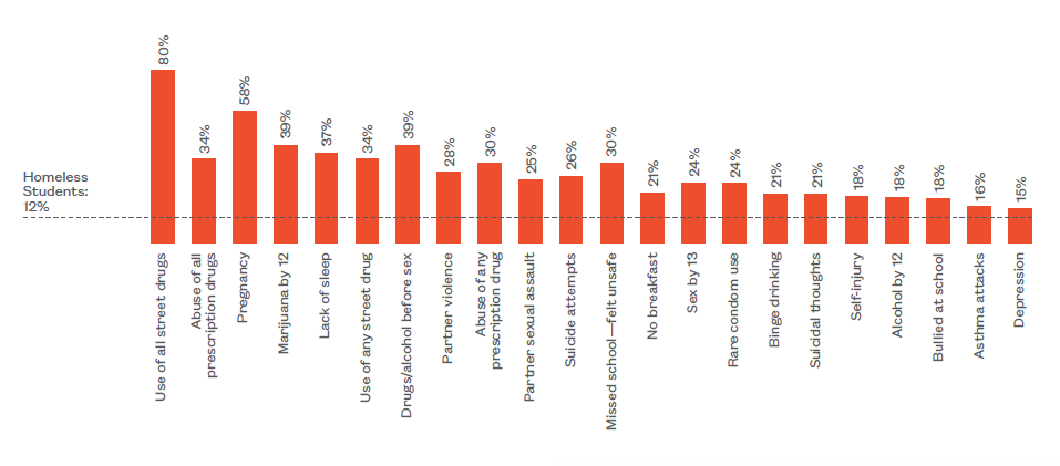 While they only make up one out of every nine students (11%) surveyed, homeless high school students make up a disproportionately large segment of students facing multiple health risks.