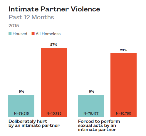 Homeless high school students were three times more likely to report having been deliberately hurt by someone they were dating than their housed peers (27% to 9%).