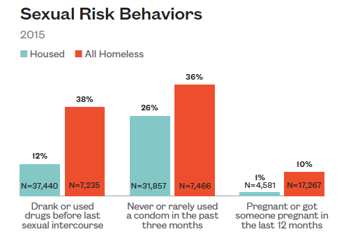 Nearly 40% of homeless high school students have sex while under the influence of alcohol or drugs, a rate over three times higher than housed students (38% to 12%).