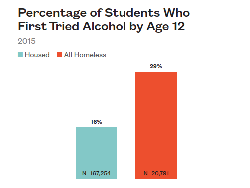 Nearly 30% of homeless high school students first tried alcohol before the age of 12—in elementary or middle school—almost twice the rate of their housed peers (29% to 16%, respectively).