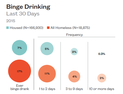 Not only are homeless students more likely than their housed peers to try alcohol at a younger age, they also are more likely to engage in dangerous drinking behavior—17% of homeless students binge drink compared to just 7% of housed teens. Homeless teens also binge drink more frequently than housed high school students.
