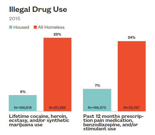 One quarter of homeless high school students have used a hard street drug such as cocaine, heroine, ecstasy or synthetic marijuana compared to only 6% of their housed peers.