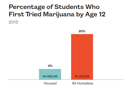 Homeless students try marijuana for the first time at a younger age than their housed peers. About one in five tried marijuana before the age of 12 compared to just 4% of housed students.