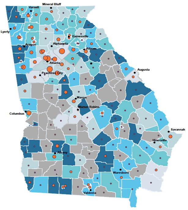- Among cities, two school districts had over 1,000 homeless students (Atlanta Public Schools and Muscogee County).