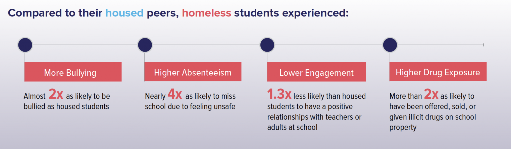 Homeless students were bullied at school or electronically at nearly twice the rate of housed students (42% vs. 23%).