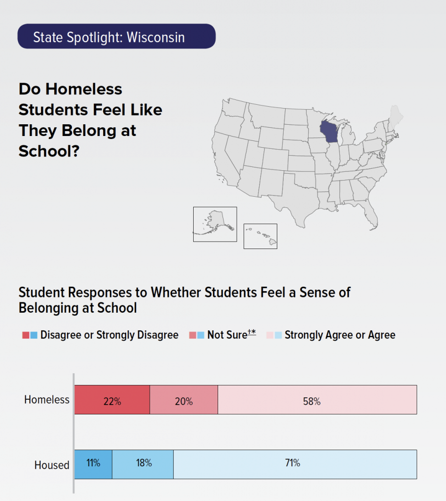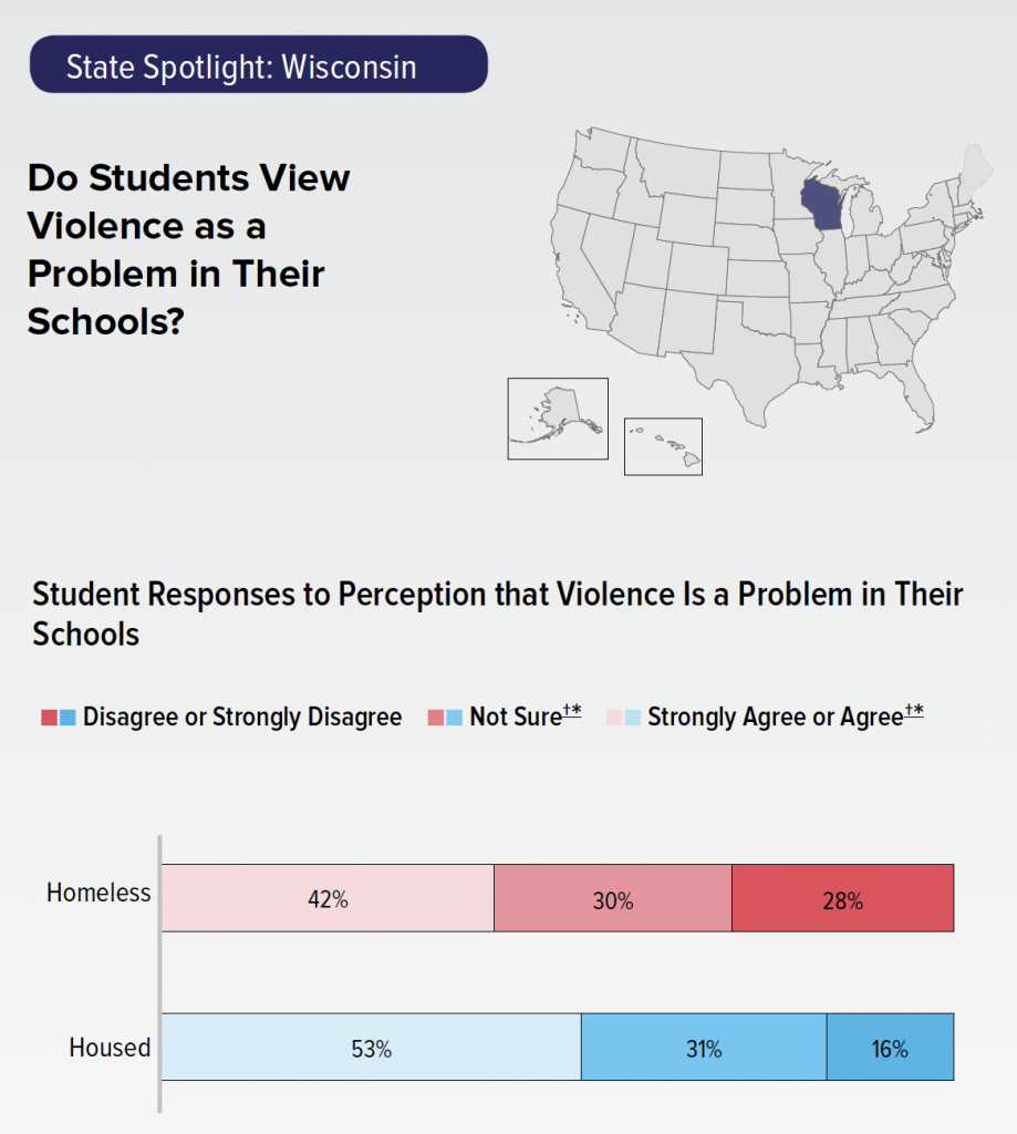 In Wisconsin, 28% of homeless students agreed or strongly agreed that violence is a problem at their school, nearly twice the rate of housed students (16%).