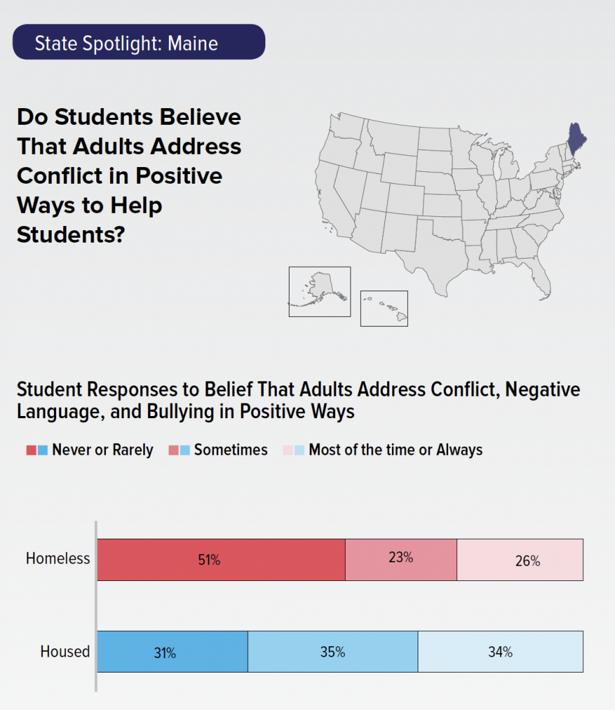 Over half (51%) of homeless students in Maine said that adults never or rarely address conflict, negative language, and bullying in positive ways to help students. When teachers can identify homeless students and acknowledge the factors that might lead to conflict involving homeless students, they can more effectively intervene when conflict arises.