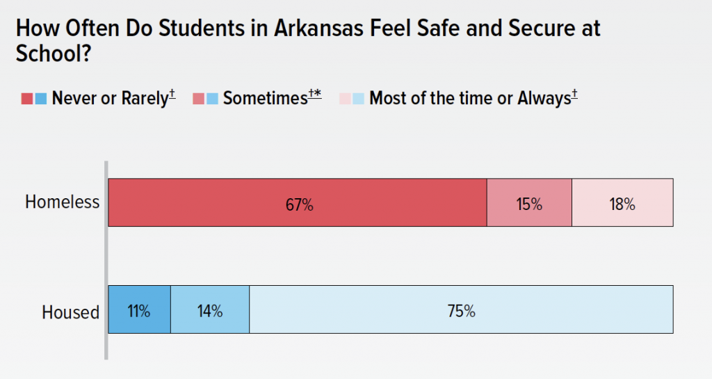 Homeless students in Arkansas were also much less likely to feel safe and secure at school. Over two-thirds (67%) of homeless students said they never or rarely felt safe and secure at school, compared to just 11% of housed students.